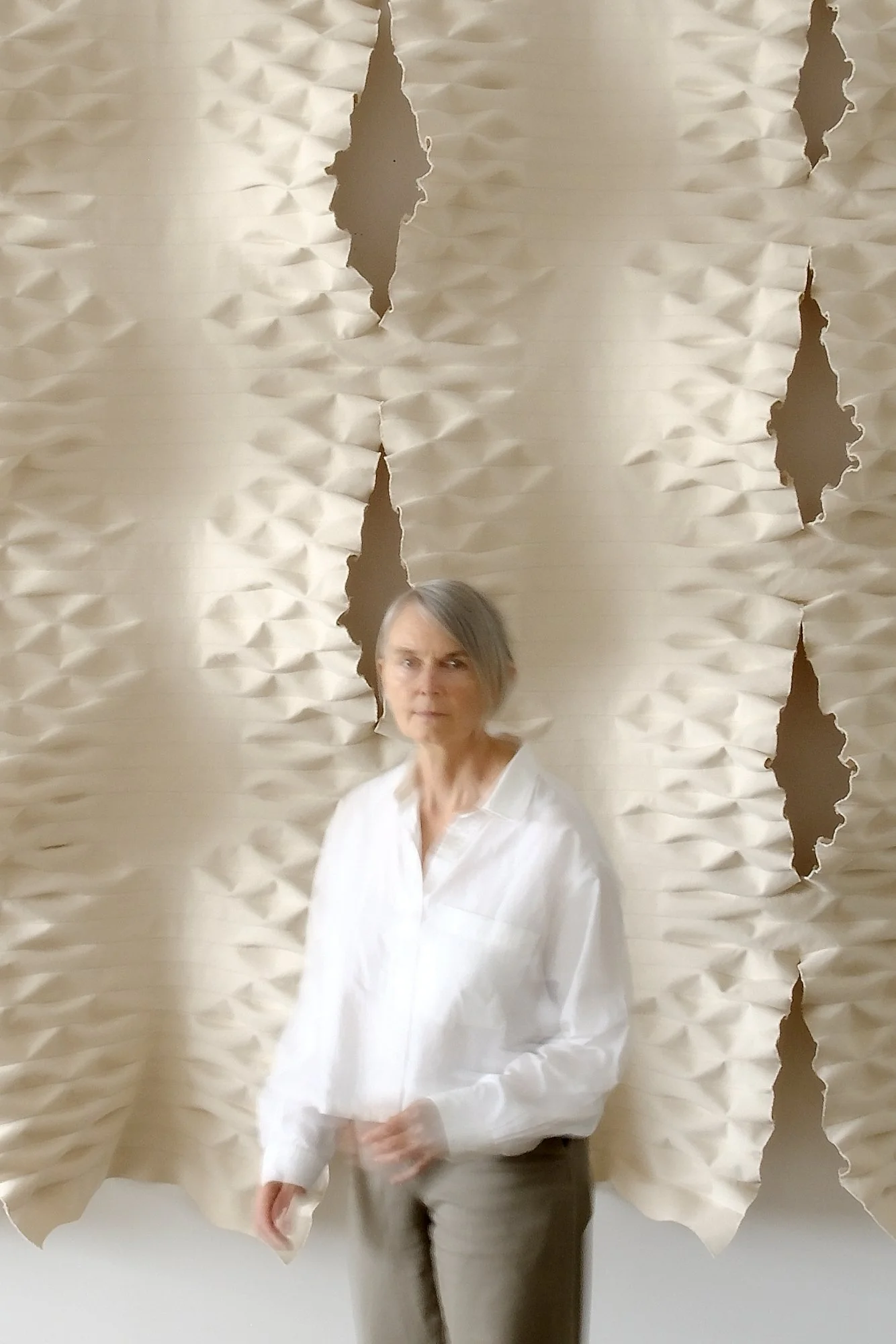 Trained at London’s Royal College of Art and a former professor at California College of the Arts, Little’s career began in furniture design, where her pieces stood out for their sculptural clarity and emotional weight. In 2015, she made a deliberate shift away from function, turning her focus toward wall-based works and immersive installations. What stayed was her material: cloth. What deepened was her approach: minimalist, meditative, and rooted in repetition.